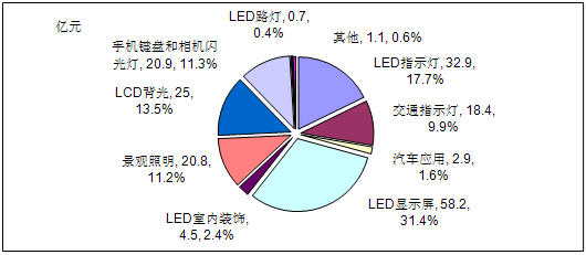 • LED顯示屏、LED指示燈、LCD背光以、手機鍵盤和相機閃光燈四大應用領域市場需求額占整體市場的73.9%