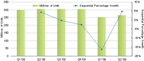據(jù)iSuppli公司,第二季度全球手機(jī)出貨量比第一季度增長4.7%,這是自2008年第三季度以來首次出現(xiàn)環(huán)比增長。第二季度全球手機(jī)出貨量為2.65億部,而第一季度是2.53億部。