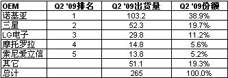下圖所示為iSuppli公司對于第二季度五大手機(jī)OEM廠商出貨量排名的初步估計(jì)。
