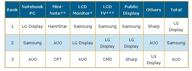 - Samsung奪魁,營(yíng)收達(dá)到42億美元,并占總體TFTLCD出貨營(yíng)收的27.8%