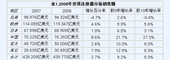 歐洲仍保持了世界連接器銷售額最大的地區(qū)的地位,2008年達(dá)119.055億美元,年增率達(dá)4.6%,過去5年的復(fù)合年增率高達(dá)9.9%,自2003以來連續(xù)6年保持增長。
