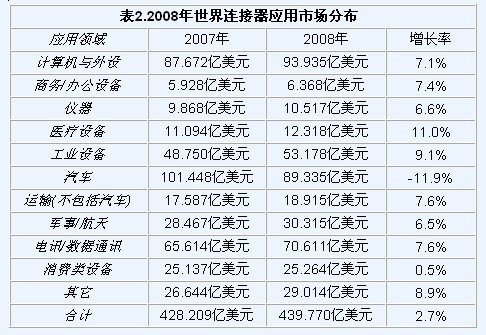 專業(yè)的連接器市場研究公司-Bishop&Associates于2009年4月公布了2008年世界連接器工業(yè)市場數(shù)據(jù),數(shù)據(jù)顯示受世界經(jīng)濟(jì)危機(jī)的拖累,2008年世界連接器工業(yè)銷售增幅急劇下滑,與上一年相比,僅增長2.7%,而2007年的增幅為7.2%,盡管如此,連接器工業(yè)仍然實現(xiàn)了6年的連續(xù)增長(2003 年11.2%, 2004年17.9%,2005年6.2%,2006年12.6%,2007年7.2%,2008年2.7%),與經(jīng)濟(jì)危機(jī)下其它電子元器件普遍負(fù)增長的糟糕表現(xiàn)相比,這一增長數(shù)字,是令人欣慰的。