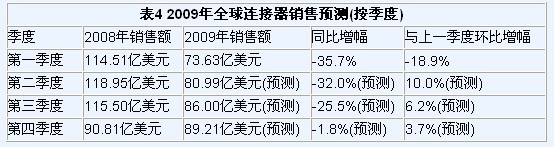業(yè)界一致的看法是2009年連接器銷售額將下降25%左右。假定在今年后三個季度內(nèi),行業(yè)實現(xiàn)環(huán)比增長,則預(yù)測如果如表4所示。如此推算,世界連接器市場需到2009年第四季度或2010年第一季度才能再實現(xiàn)年度同比增長。