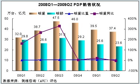 • 2009年上半年等離子電視銷售56.7萬臺,42.1億元,市場份額分別為14.4%和14.5%