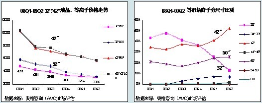 在以上雙重因素的作用下,等離子市場32、42和50英寸產品三足鼎立的局勢被打破,出現了42英寸占據半壁江山的局面。據奧維咨詢(AVC)數據顯示:32英寸產品比重已由08Q1的43.4%跌至09Q2的13.0%,而42英寸產品則由34.7%攀升至52.4%。