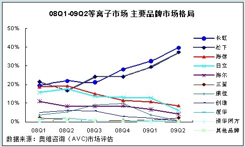 • 2009年上半年等離子市場長虹、松下市場占有率分別達35.4%、32.4%,二者合計達到67.8%