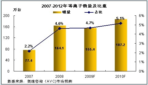 考慮到未來平板電視市場的走勢、結合等離子上下游產業情況,奧維咨詢(AVC)預測:2009年全年等離子銷量為155.4萬臺,與2008年的總量基本持平。2009年下半年,受液晶市場的規模優勢擠壓,第三、四季度等離子電視的銷量因彩電旺季到來將上升至78.6萬臺,但占市場比重將下降至4.3%。