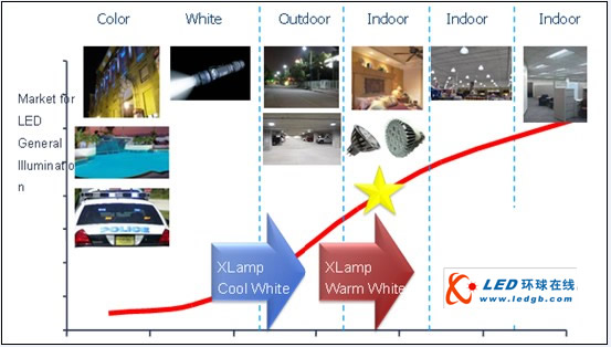 LED市場發展與市場基礎大小有絕對影響,2001年LED進入手機市場,使得整體市場呈現出第一波高度成長,特別是高亮度LED市場在2001~2004年間實現了高達46%的年成長率。但在2004年以后,隨著彩色屏幕手機的比例超過了80%,顯示器背光改用白光LED的速度減緩,再加上臺灣地區和韓國廠商還推出鍵盤用低價格LED,使LED價格出現顯著下滑。在缺乏新市場帶動,舊有市場基礎成長遲滯影響下,2005年后全球LED市場陷入低度成長態勢。
