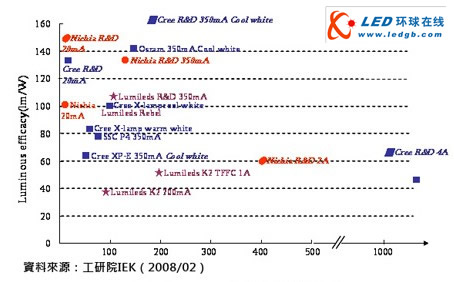 2001年標準型白光LED(20mA)發光效率僅25lm/W,至2009年初Nichia發表之白光LED,在20mA電流下,其發光效率可達249lm/W,為目前業界之最。高功率白光LED(350mA)發光效率也由2004年約30 lm/W,截至2008年年底Cree發表161lm/W產品為業界之最。