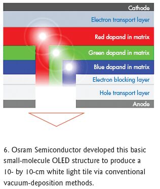 成員之一的歐司朗半導體公司去年展示了一款10×10cm的OLED面板,它在1000cd/m2條件下,具有30至50lm/W的光輸出,壽命為5000小時。在歐司朗這一工作的中間環節,還證明了OLED的白光輸出能比以前取得的較低水平有提高。歐司朗采用的是基本的真空沉積技術,使用的是小分子而不是可打印聚合物(圖6)。歸功于與BASF AG的合作,該面板的光輸出后增至60lms/W。