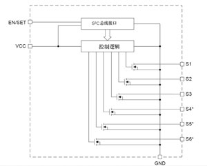 該器件主要特點:輸入電壓范圍為1.8~5.5V;內(nèi)部有6個低端N溝通MOSFET開關(guān),每個開關(guān)都是獨立的;可采用單個串行控制線(S2C線)對各個開關(guān)實現(xiàn)通、斷控制;靜態(tài)電流少,典型值為3μA;每個開關(guān)可驅(qū)動208mA;無須其他外圍元件;12引腳TSOP封裝;工作溫度范圍-40~+85℃。