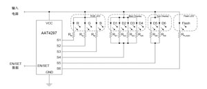 如果有需要也可并接多個RGBLED。S4接D1~D4白光LED,它用作彩色主顯示屏背光照明,S6接閃光燈LED,作相機閃光燈用。根據(jù)手機的不同工作狀態(tài),由μP向EW/SET輸入不同的數(shù)字信號,可實現(xiàn)LED的負(fù)載管理。數(shù)字信號的頻率可高達(dá)1MHz。利用輸入EN/SET信號使LED亮的時間與滅的時間交替進行,改變亮、滅的時間,可以實現(xiàn)LED亮度調(diào)節(jié)。