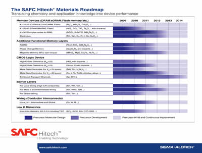今年七月,在舊金山舉行的 Semicon West 展會上,我們針對硅半導(dǎo)體基底的化學(xué)氣相沉積 (CVD) 和原子層沉積 (ALD) 工藝公開了新的材料發(fā)展規(guī)劃。 規(guī)劃(圖 1 )概述了當(dāng)前及未來先進(jìn)的存儲和邏輯設(shè)備的發(fā)展道路,包括阻擋層、互連、介電材料和金屬,我們預(yù)期逐步推出,直至 2014 年完成。