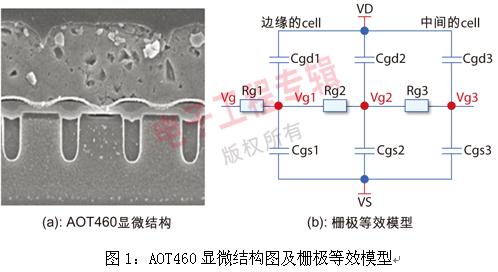通常從外部來(lái)看,MOSFET是一個(gè)獨(dú)立的器件,事實(shí)上,在其內(nèi)部,由許多個(gè)單元(小的MOSFET)并聯(lián)組成,圖1(a)為AOT460內(nèi)部顯微結(jié)構(gòu)圖,其內(nèi)部的柵極等效模型如圖1(b)所示。MOSFET的結(jié)構(gòu)確定了其柵極電路為RC網(wǎng)絡(luò)。