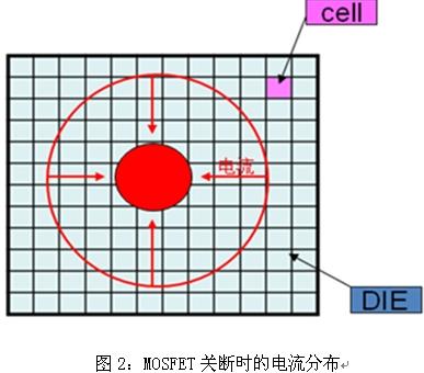 如果MOSFET所加的負(fù)載為感性負(fù)載,由于電感電流不能突變,導(dǎo)致流過(guò)MOSFET的電流向晶元的中間流動(dòng),如圖2所示。這樣就會(huì)造成MOSFET局部單元過(guò)熱而導(dǎo)致MOSFET局部單元損壞。如果加快MOSFET的關(guān)斷速度,以盡量讓MOSFET快速關(guān)斷,不讓能量產(chǎn)生集聚點(diǎn),這樣就不會(huì)因局部單元過(guò)熱而損壞MOSFET。注意到:MOSFET的關(guān)斷過(guò)程是一個(gè)由穩(wěn)態(tài)向非穩(wěn)態(tài)過(guò)渡的過(guò)程,與此相反,MOSFET在開(kāi)通時(shí),由于負(fù)載的電流是隨著單元的逐漸開(kāi)通而不斷增加的,因此是一個(gè)向穩(wěn)態(tài)過(guò)渡的過(guò)程,不會(huì)出現(xiàn)關(guān)斷時(shí)產(chǎn)生的能量集聚點(diǎn)。
