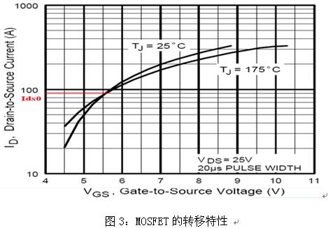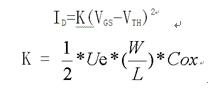 圖3為MOSFET處于飽和區(qū)時(shí)漏極電流ID與柵極電壓VGS的關(guān)系曲線即轉(zhuǎn)移特性,用公式可表示為: