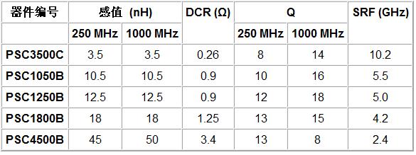 螺旋電感具有1nH~100nH的寬感值范圍,采用0.045英寸x0.045英寸x0.010英寸的小尺寸外形。PSC器件同時具有低寄生電容、低至0.26Ω的DCR、高達10.2GHz的SRF,在250MHz和1000MHz下的Q值分別為13和18。