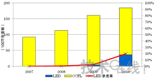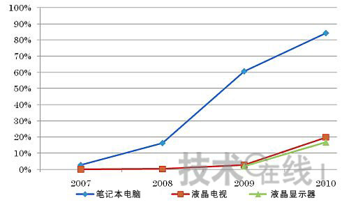 筆記本電腦面板配備LED背照燈早于液晶電視面板,于2007年就全面開始了。2009年的LED背照燈配備比例達(dá)到了60%以上。預(yù)計(jì)2010年開始將全面向LED背照燈時(shí)代過(guò)渡。在2010年配備比例將達(dá)到80%以上,2012年之前將全面改用LED背照燈。