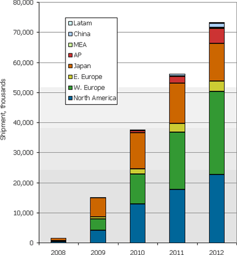 另外,有互聯網功能的電視也將蓬勃發展,DisplaySearch公司預測有互聯網(Internet)功能的網絡電視將由2009年的1千5百萬臺成長到2012年的7,000萬臺以上。