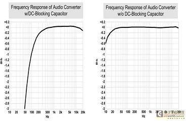 用來隔離DC電流的最常見技術(shù)是采用去耦電容,如圖1所示。在信號(hào)路徑中放置一個(gè)電容可以創(chuàng)建一個(gè)高通濾波器,其角頻率由耳機(jī)阻抗(R)和去耦電容(C)設(shè)置,等于1/(2πRC)。通常人的耳朵能夠聽到聲音頻率最低為20Hz。根據(jù)這個(gè)下限和耳機(jī)的典型阻抗,可很容易地計(jì)算出所需的電容值。對(duì)于20Hz的角頻率,電容容值取500uF。