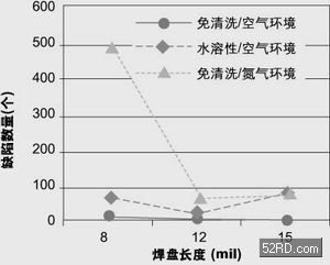 圖3給出了焊點(diǎn)缺陷數(shù)量與焊盤長度及組裝工藝的關(guān)系。與前一張圖類似,這些數(shù)據(jù)也是在每種組裝工藝選用最佳焊盤形式時(shí)得出,試驗(yàn)將焊盤寬度和焊盤間距設(shè)為常量,只對(duì)焊盤長度進(jìn)行變化。從圖上我們可以看到,對(duì)所有三種組裝工藝而言最佳焊盤長度都是0.012這個(gè)中間值,通常來說焊盤長度在0.008到0.012英寸之間對(duì)良品率的影響最大。從組裝工藝方面來看,免清洗焊膏在充氮環(huán)境下焊接對(duì)造成不良的影響最為敏感,比其他工藝更容易受焊盤長度的影響。使用免清洗焊膏在空氣中焊接時(shí),焊盤長度為0.012英寸和0.016英寸均沒有發(fā)現(xiàn)任何焊點(diǎn)缺陷。