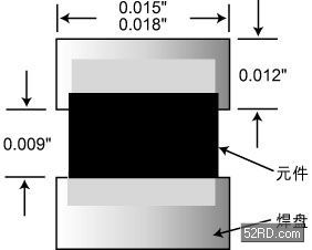 圖4給出批量進(jìn)行0201元件回流焊時(shí)的元件焊盤設(shè)計(jì)建議。建議兩焊盤間距0.009英寸,焊盤長度0.012英寸,寬度在0.015英寸到0.018英寸之間,具體取決于助焊劑成分類型和焊膏回流焊環(huán)境。0.018英寸寬度適用于充氮焊接環(huán)境、氧氣含量很低(50ppm以下)以及焊劑活性很強(qiáng)或潤濕時(shí)間很短的情況;而0.015英寸寬度焊盤則適用于在空氣環(huán)境中進(jìn)行回流焊接、焊膏溶劑活性較弱以及有較長的潤濕時(shí)間等情況。
