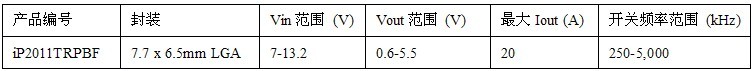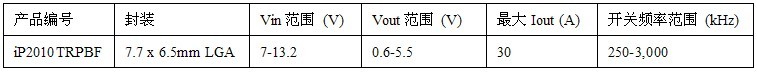 iP2010的輸入電壓范圍為7V至13.2V,輸出電壓范圍則為0.6V至5.5V,輸出電流高達30A。這個器件最高運行頻率為3MHz。在5MHz運行時,與iP2010引腳兼容的iP2011備有相同的輸入和輸出電壓范圍,但后者經過優化,從而使最高輸出電流高達20A。通過以通用占位面積提供多種電流額定值器件,IR提供的靈活性能夠滿足不同客戶對電流水平、性能和成本的要求。
