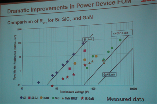 這個采用氮化鉀材料的新器件可以將系統的效率改善3.5%到7%,采用簡單的熱控制即可達到節能效果,在目前綠色節能的大趨勢下可以發揮重要作用。在改善功率器件的優值系數方面,這個氮化鎵 (GaN) 功率器件也表現突出,如下圖所示。