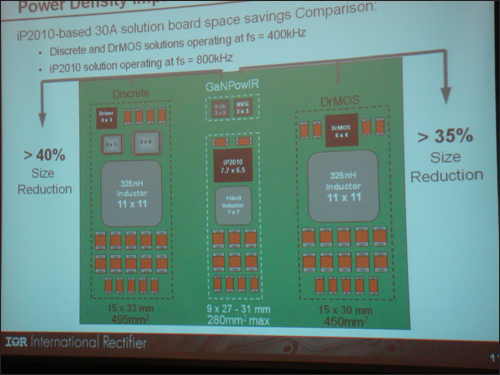 采用分立器件,GaNpowIR技術,DrMOS方案功率密度比較