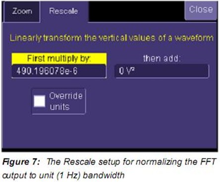 在重標刻度后,F2中的FFT的垂直單位是 V2√Hz。通過對FFT跡線以下的區域積分可以確認重標刻度的正確性。Figure 5中用門限到用來限制噪聲源帶寬的濾波器的噪聲帶寬的區域參數來實現,該處是280kHz。F2以下的區域是平均平方值, 32.575 E-6 V2。可以和C2中波形的平均平方值(變量)計算所得的參數P3 32.575 E-6 V2比較。