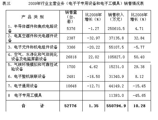 2009年各類(lèi)電子專(zhuān)用設(shè)備和電子專(zhuān)用工模具的銷(xiāo)售情況見(jiàn)表三。