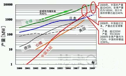 - 2000年以后,全球太陽能電池產(chǎn)量以年均40%左右的速度增長(zhǎng)
