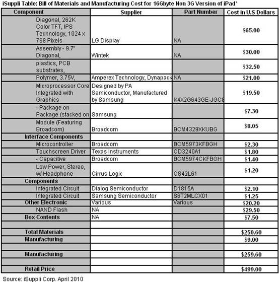 根據(jù)對(duì)16GB非3G版iPad的物理拆機(jī)分析,iSuppli公司估計(jì)低端16GB非3G版iPad的材料成本(BOM)為250.60美元。如果計(jì)入生產(chǎn)費(fèi)用,成本是259.60美元。