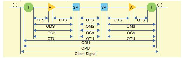 根據G.872建議要求,OTN包括由光纖鏈路連接的光網絡單元(圖2所示),能夠提供光通道承載客戶信號的傳送、復用、路由、管理、控制和生存等功能。