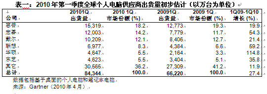 據(jù)Gartner發(fā)布的初步統(tǒng)計結(jié)果,2010年第一季度全球個人電腦出貨量已達到8,430萬臺,與2009年同期相比增長27.4%,這一結(jié)果超過了Gartner此前所作的22%的增長預測。