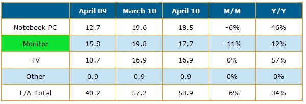 表一 2010年3-4月大尺寸TFT LCD面板按應用出貨量(單位:百萬片)