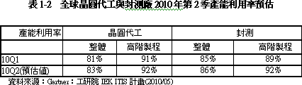 在IC制造業(yè)部分,預(yù)估2010Q2漸步入季節(jié)性需求上升期,配合產(chǎn)能逐步開出,臺(tái)灣IC制造業(yè)可望呈現(xiàn)價(jià)量齊揚(yáng)的階段,帶動(dòng)臺(tái)灣IC制造業(yè)產(chǎn)值上揚(yáng),預(yù)估可較2010Q1成長6.6%,并較去年同期成長47.6%
