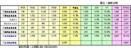2010Q1由于全球景氣好轉(zhuǎn),再加上新興市場需求持續(xù)強(qiáng)勁,所以呈現(xiàn)淡季不淡之情況。2010年第一季臺(tái)灣整體IC產(chǎn)業(yè)產(chǎn)值(含設(shè)計(jì)、制造、封裝、測(cè)試)達(dá)新臺(tái)幣3,846億元,較上季(09Q4)成長1.8%,較去年同期(09Q1)成長88.9%。其中設(shè)計(jì)業(yè)產(chǎn)值為新臺(tái)幣1,036億元,較上季(09Q4)成長0.1%,較去年同期(09Q1)成長38.5%;制造業(yè)為新臺(tái)幣1,885億元,較上季(09Q4)衰退0.2%,較去年同期(09Q1)成長134.2%;封裝業(yè)為新臺(tái)幣640億元,較上季(09Q4)成長7.9%,較去年同期(09Q1)成長91.0%;測(cè)試業(yè)為新臺(tái)幣285億元,較上季(09Q4)成長8.4%,較去年同期(09Q1)成長92.6%。