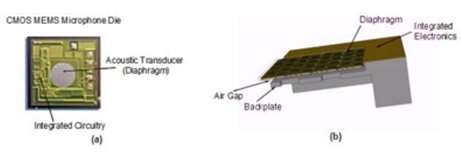 在CMOSMEMS平臺上開發的單塊集成電路硅晶麥克風解決方案使消費電子設備設計人員和制造商得以避免眾多ECM相關問題。下圖是一個單芯片硅晶麥克風的俯視圖和橫截面圖。這一單塊芯片由MEM換能器(transducer)和阻抗匹配線路組成,它也是一個帶有可移動振膜和剛性背板的電容性傳感器。