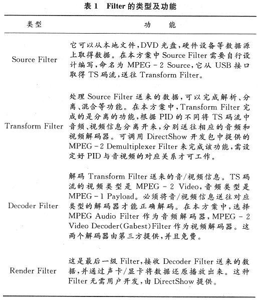 軟件方面,PC機端應用程序的核心部分是實時播放器,需要播放的是TS碼流,這是MPEG-2標準定義的一種碼流。本方案采用基于DirectShow技術搭建的媒體播放器。DirectShow是DirectX家族中的成員,它為在Windows平臺上處理各種格式的多媒體文件的回放、音視頻采集等高性能要求的多媒體應用提供了完整的解決方案,重要的是它很好地支持了MPEG-2標準,它使應用程序開發人員從復雜的數據傳輸、硬件差異、同步性等工作解脫出來,總體應用框架和底層工作由DirectShow來完成,大大加快了開發進度。
