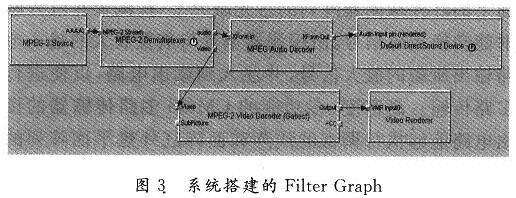 (2)搭建實時媒體播放器,將所接收到的TS碼流解碼播放。這是PC機應用程序的核心部分。在選擇搭建實時媒體播放器的策略上有兩種方法:一是利用開源的播放器進行修改,但絕大多數開源播放器都是基于Linux平臺下編寫的,要在Windows平臺下使用需要經過移植才行,移植工作量很大,且移植后播放器穩定性較難控制。另一個是基于DirectShow技術,自行編寫播放器。DirectShow是微軟DirectX家族中的成員,與Windows有著天然的“血緣”關系,是Windows平臺下搭建媒體播放器的最佳選擇。并且微軟提供了相應的開發套件,使得開發工作量得以減少,開發周期大大縮短?;谝陨显颍痉桨高x擇基于DirectShow技術搭建實時媒體播放器。