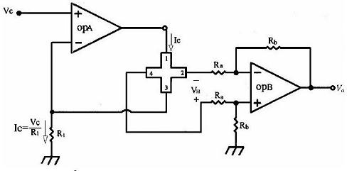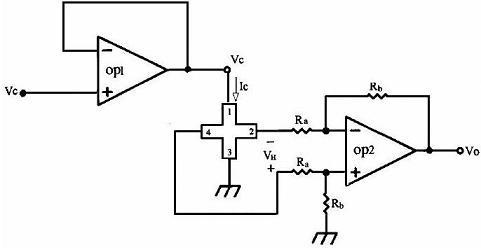 磁場強度可利用形成在結晶片的一部份的霍爾組件變換成電氣信號(參照前述霍爾組件的作用原理)。結晶通常使用半導體硅,霍爾組件的磁場靈敏度為10~20mV/K.Oe。此信號經形成在同一結晶中的信號處理電路放大后,作為適合所定目的的信號電壓被取出。通常四根導線中的兩根連接于一方接地的電源,而從剩下的兩根的一根取出正極性的信號電壓,并從另一根取出負極性的信號電壓。霍爾組件的輸入電阻通常需符合信號處理電路的電源,以便可利用定電壓使用霍爾組件。此時組件的輸出電壓不管在N型或P型均無大差異。又因輸出電壓與電子或正孔的移動度成正比,故溫度特性也應該盡量保持一定,這是與單體霍爾組件不同的地方。