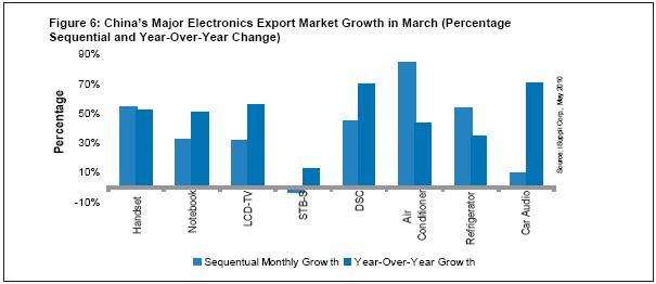 據(jù)iSuppli公司,3月份中國電子產(chǎn)品出口大幅增長,多數(shù)產(chǎn)品的環(huán)比和同比增長速度均達(dá)到了兩位數(shù)。