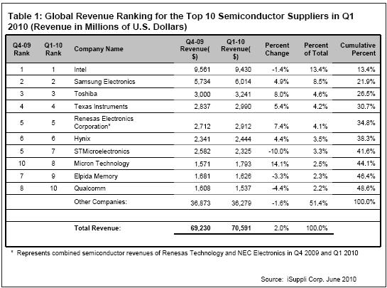 在全球排名前10的半導(dǎo)體供應(yīng)商中,2010年第一季度有六家銷售收入高于2009年第四季度。表1所示為iSuppli公司對(duì)2010的第一季度全球10大半導(dǎo)體供應(yīng)商的排名。