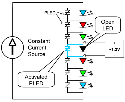 PLED設(shè)計是一種電壓觸髮型電子分路裝置,當某個LED出現(xiàn)開路故障時,該裝置能夠提供電流旁路。當某個LED故障時,該設(shè)計可避免整個LED燈串都無法正常工作的情況。