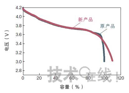放電曲線與原來相同 新產品的最大特點是,具有與原有鋰離子充電電池幾乎相同的放電曲線,并且實現了高容量化(圖1)。由于充電電壓和工作電壓與原來的鋰離子充電電池相同,因此產品廠商無需改變產品的電源系統即可利用。