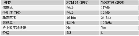 在過去的15年里,ADC和DAC系統的性能一直在穩定地增長。下面的音頻DAC表簡要列出了今天最先進的DAC和1986年最先進的DAC之間的性能比較。現在,將廣泛的數字濾波技術集成進今天的DAC轉換器中不僅在技術上是可行的,而且也非常經濟。如WolfsonMicroelectronics公司的DAC器件WM8740具有完全支持最新DVD-Audio標準、CD和其它使用PCM格式數據的數字音頻系統的架構。