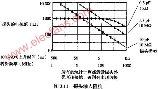 參見圖3.11,在我們關(guān)注的上升時間范圍內(nèi),探頭的并聯(lián)電容越高,阻抗會越低。在高頻時,只有并聯(lián)電容比較重要。