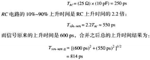如第三個波形所示,當連接的串聯(lián)電感很小時,探頭等效于一個簡單的電容負載。圖3.12所示的測試點等效信號源端阻抗為25歐,當耦合到10PF的容性負載時,其RC上升時間是: