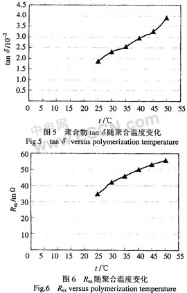 (2)聚合溫度對電容器的tanδ和Res有較大影響。電容器的tanδ和Res隨反應溫度增加而增大,最佳聚合反應溫度為25℃。